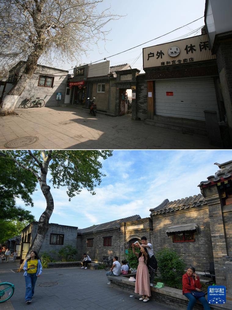 拼版照片:上图为2018年6月8日拍摄的雍和宫大街40号附近商铺和原有广告牌匾(资料照片);下图为2024年5月11日拍摄的改造后的雍和宫大街40号(新华社记者鞠焕宗摄)。