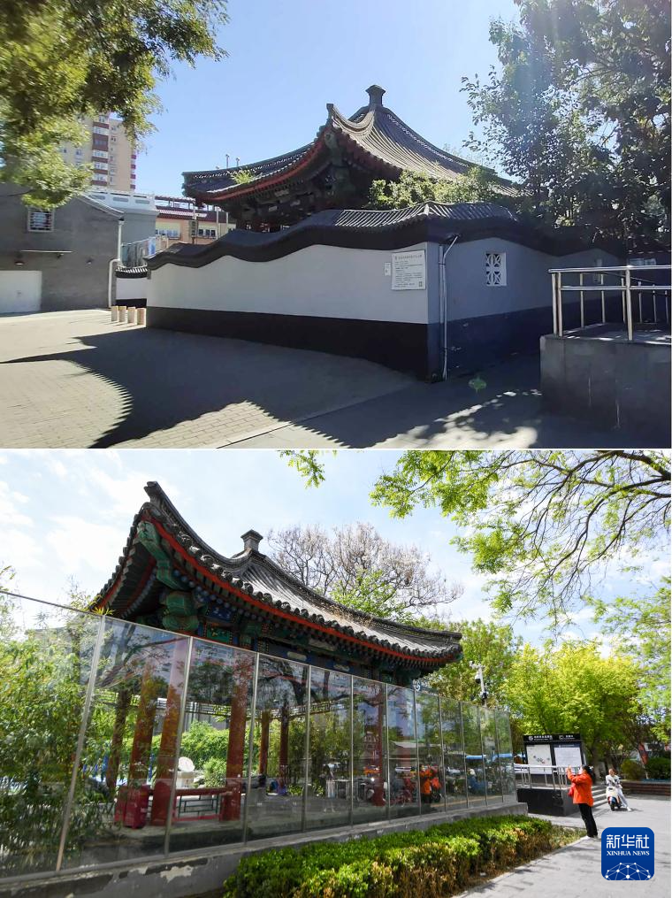 拼版照片:上图为北京市东城区东四九条小学围墙内的贝子奕谟府遗存——咏竹亭(资料照片);下图为2024年4月23日,一位行人参观咏竹亭,崇雍大街改造中将此处封闭围墙改造为透景围墙(新华社记者鞠焕宗摄)。