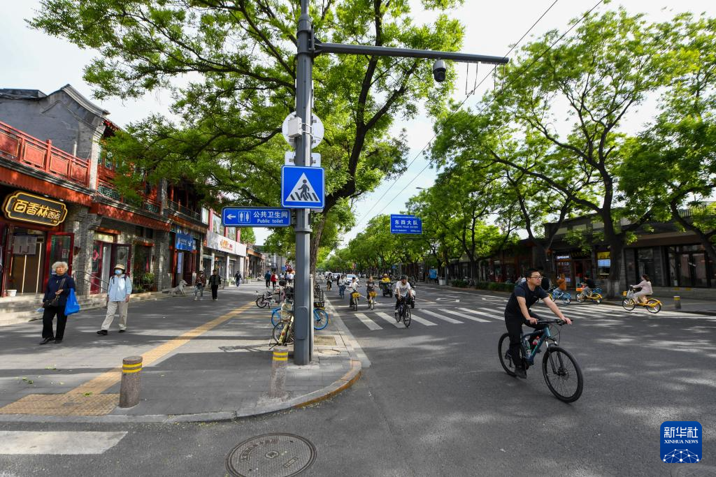 5月1日,市民游客在东四北大街骑行。崇雍大街改造推动“慢行优先”“健步悦骑”,推动“车辆优先”向“行人优先”转变,实现骨干道路功能转型为绿色交通主导,让“健步悦骑”体验更为顺畅。