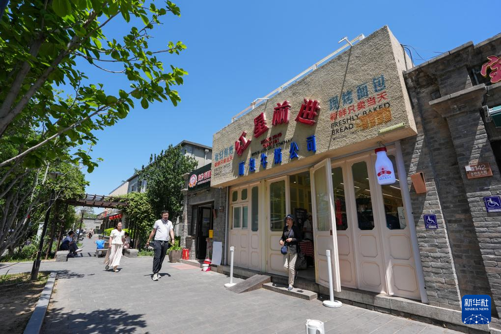 在东四北大街138号的一家面包店,顾客选购商品后离开店铺(5月11日摄)。