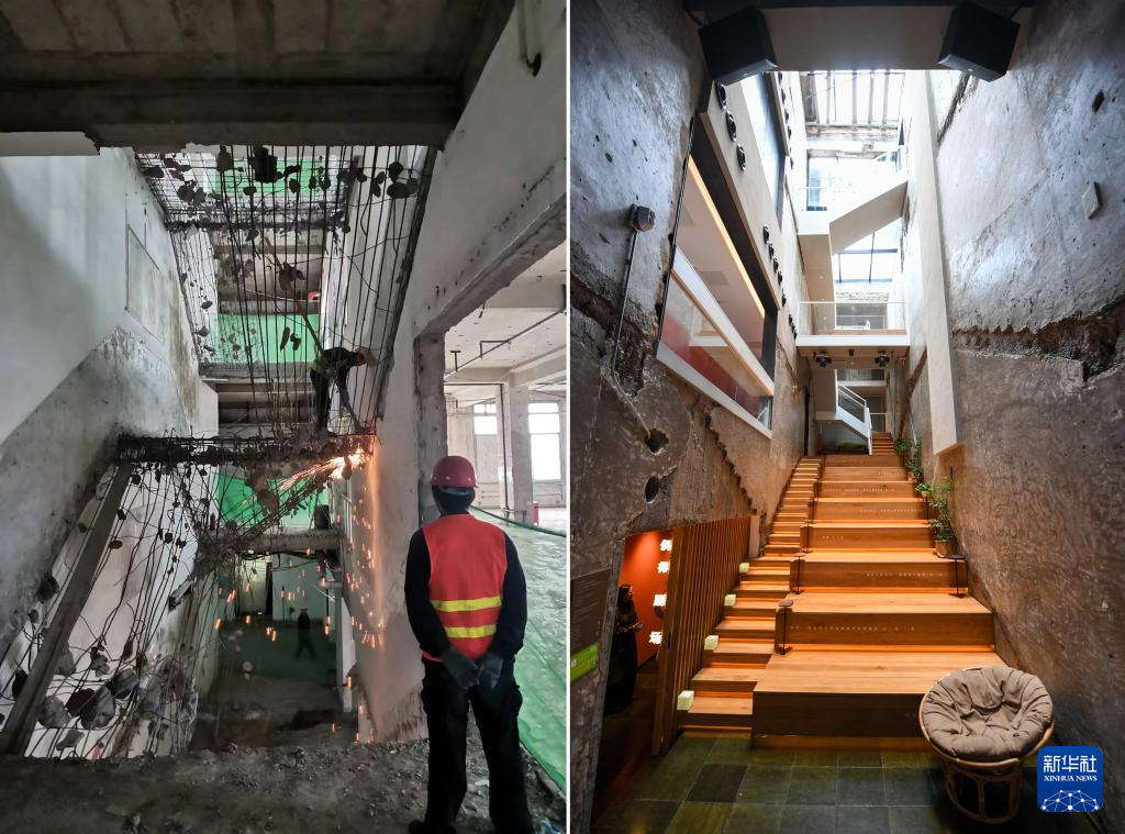 左图为改造中的位于东四南大街的原三友商场楼梯间(资料照片);右图为2024年4月23日拍摄的由原三友商场楼梯间改造而来的雪莲·亮点文创园偶得剧场(新华社记者鞠焕宗摄)。