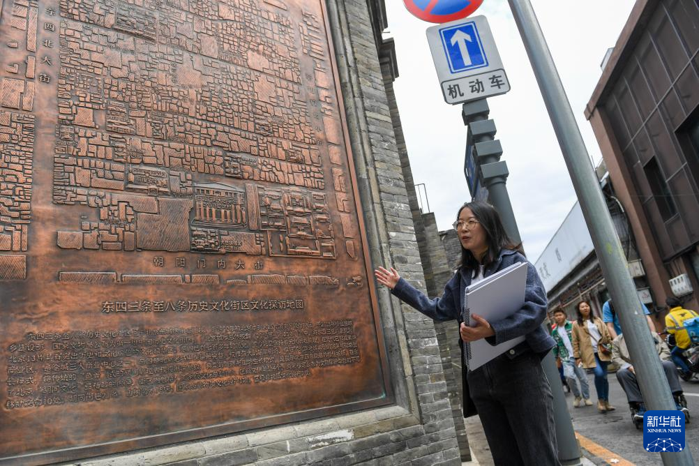 中国城市规划设计研究院高级工程师、崇雍大街整治提升工程的建筑专业负责人孙书同介绍崇雍大街改造中设置的历史文化街区探访地图(4月23日摄)。