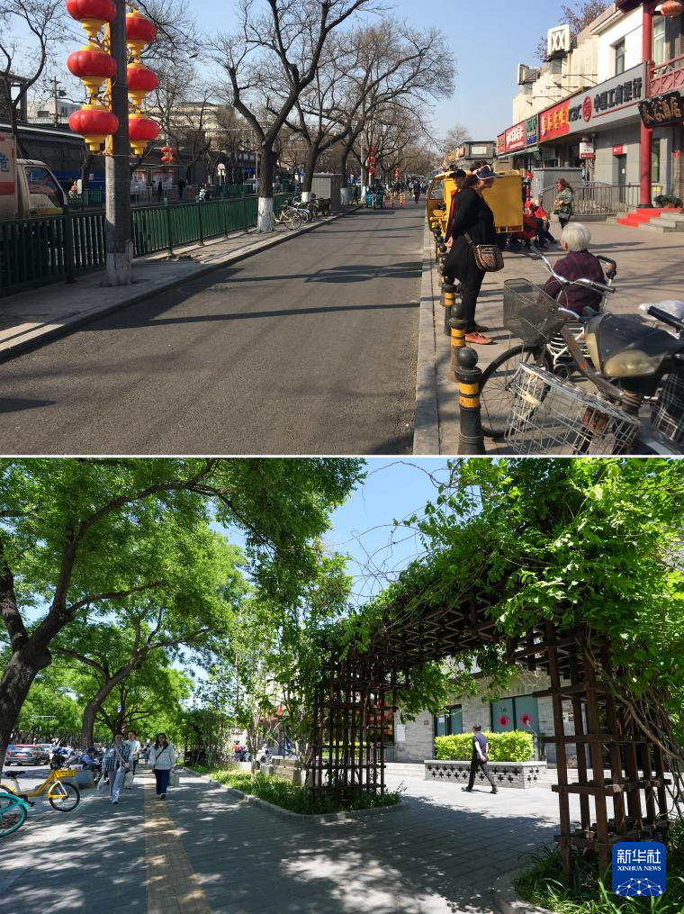 拼版照片:上图为2018年3月25日拍摄的东四北大街126号附近一处道路(资料照片);下图为2024年5月11日拍摄的相同地点,道路改造后步行空间被拓宽,并增加了街边绿地花园(新华社记者鞠焕宗摄)。