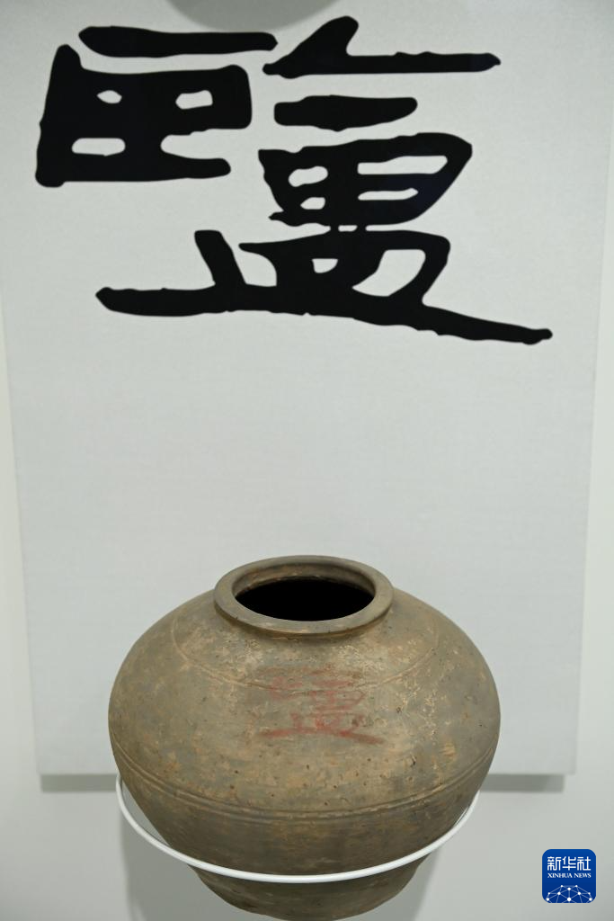 陕西历史博物馆秦汉馆内展出的东汉朱书陶罐(5月13日摄)。