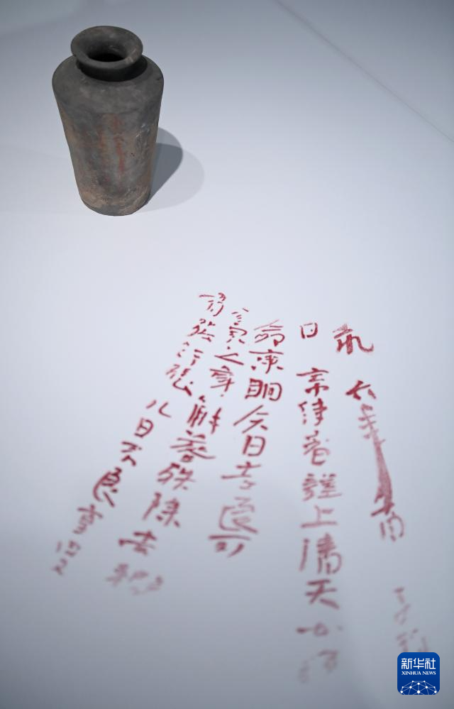 陕西历史博物馆秦汉馆内展出的东汉朱书陶瓶(5月13日摄)。