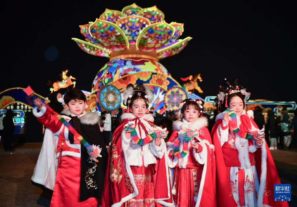 在西安大明宫国家遗址公园,身着汉服的小朋友参加2024年长安灯会(2024年2月2日摄)。