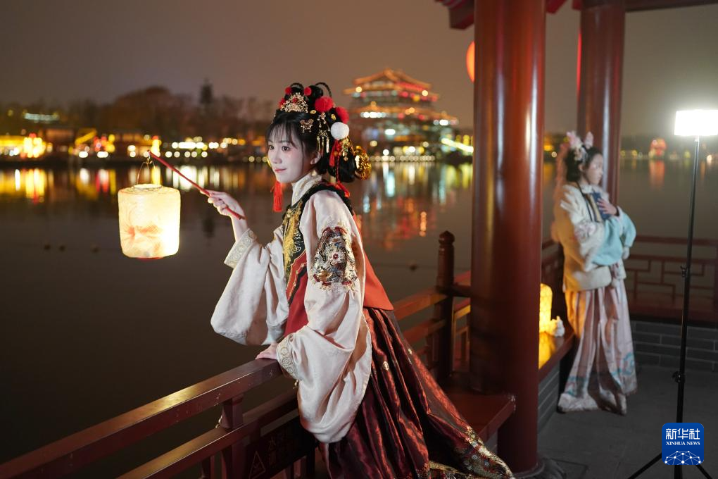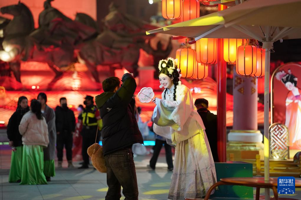 游客身穿汉服体验“夜游长安”(2024年2月13日摄)。