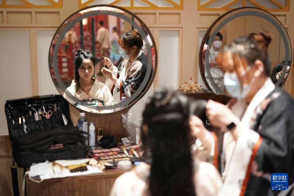 游客在西安长安十二时辰景区进行化妆造型(2022年5月19日摄)。