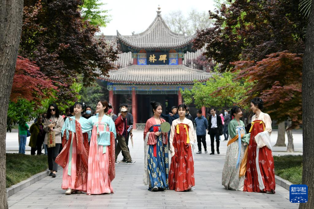 汉服爱好者在西安碑林博物馆参观(2021年4月14日摄)。