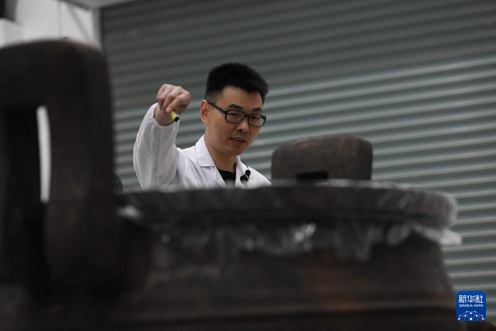 5月20日,武王墩考古项目实验室负责人张治国在介绍出土文物。