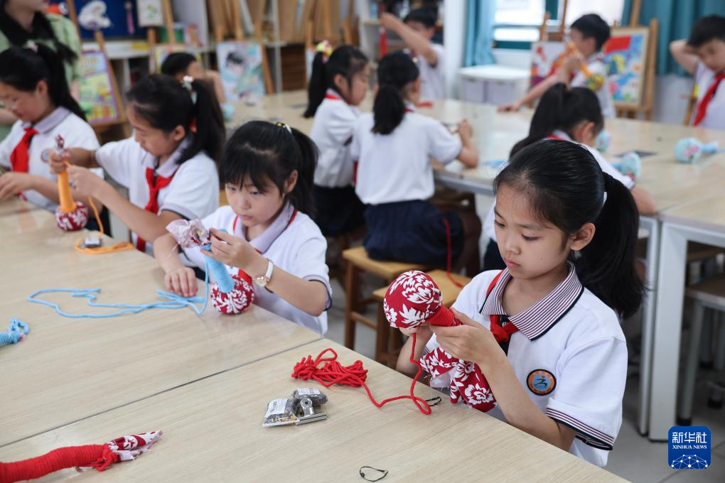 5月22日,太湖小学的学生们在特色课程上学习端午“五彩绳”的编织。