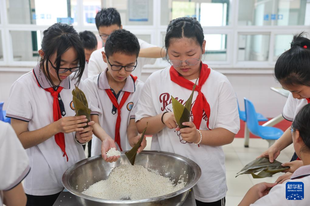 5月22日,太湖小学的学生们在特色课程上学习包端午粽子。