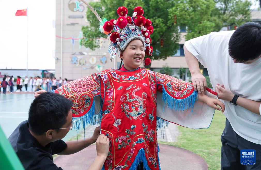 5月22日,太湖小学的学生在非遗传承人的帮助下穿上金溇马灯的表演服装。“金溇马灯”作为吴兴高新区幻溇村当地的特色民俗表演项目,至今已有100余年的历史,是太湖当地百姓逢年过节重要的喜庆民俗活动。