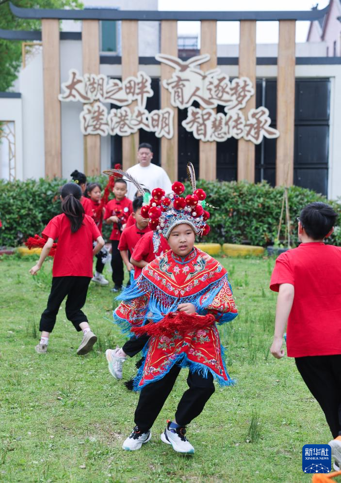 5月22日,太湖小学的学生们在非遗传承人的指导下学习金溇马灯的表演。“金溇马灯”作为吴兴高新区幻溇村当地的特色民俗表演项目,至今已有100余年的历史,是太湖当地百姓逢年过节重要的喜庆民俗活动。
