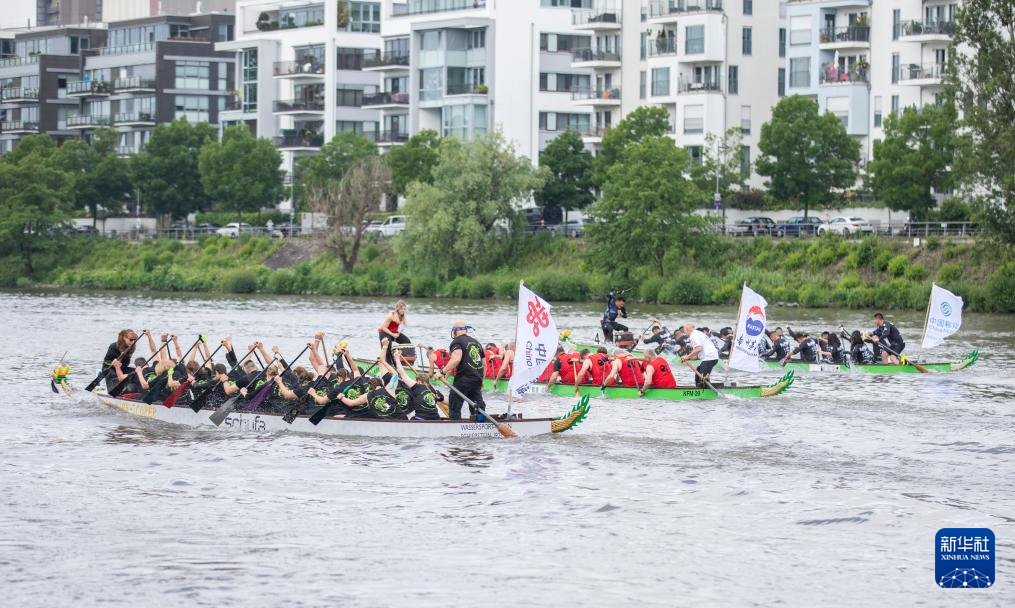 5月25日,在德国法兰克福,龙舟队伍在美因河上参加比赛。