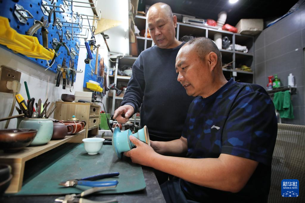杨涛在工作室展示锔瓷修复的瓷器(5月8日摄)。