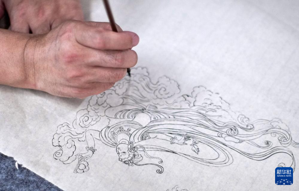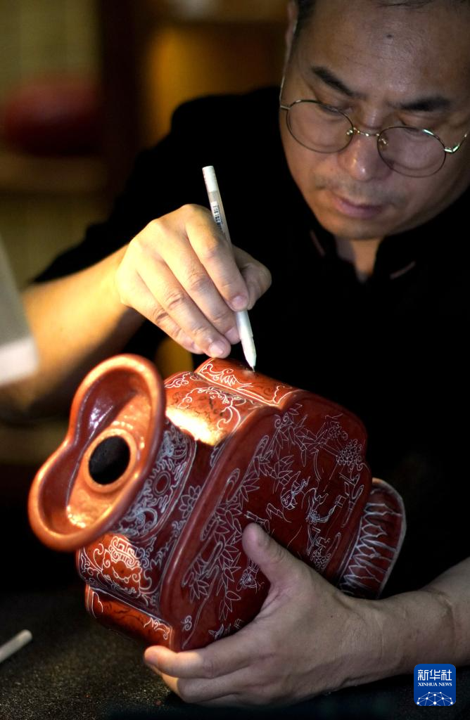 朱江在工作室为髹漆后的胎体绘制线稿(6月5日摄)。