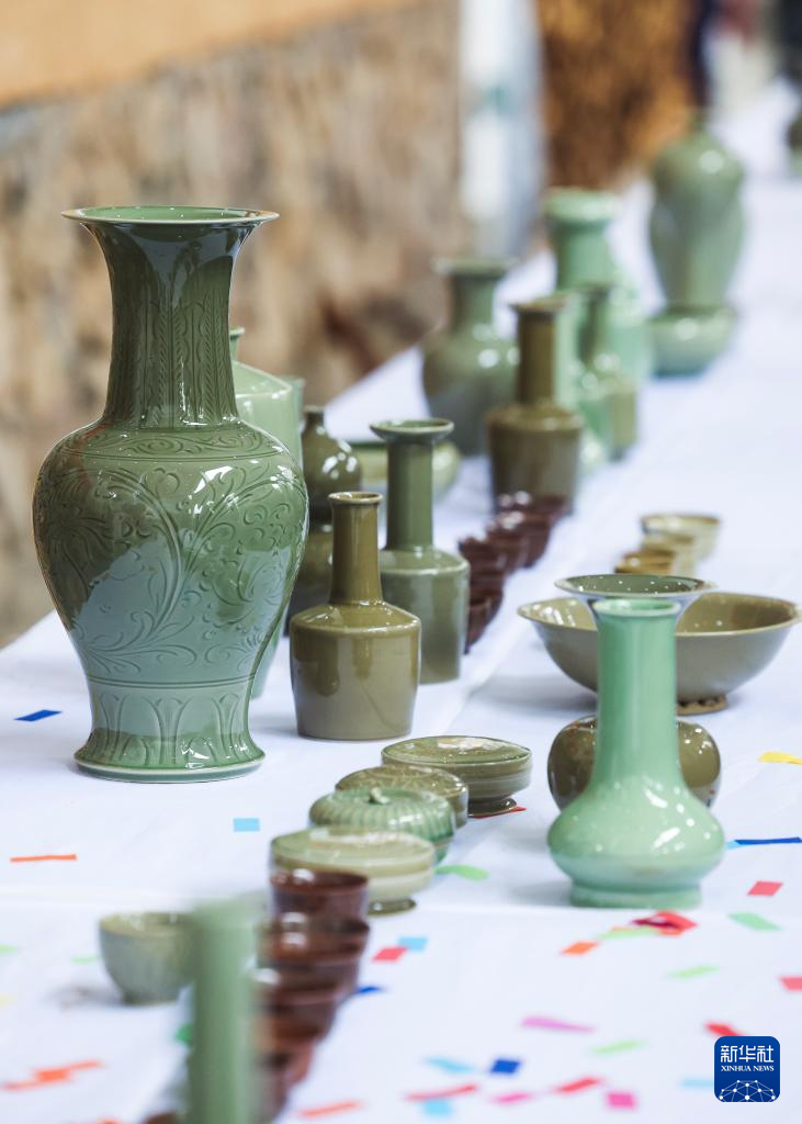 6月6日在慈溪市上林湖青瓷传承园举行的开窑仪式上拍摄的经过传统柴烧龙窑烧制的越窑青瓷作品。
