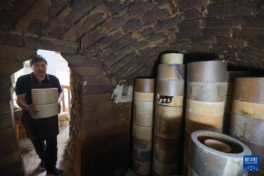 5月31日,在慈溪市上林湖青瓷传承园,工作人员为龙窑添柴烧火。