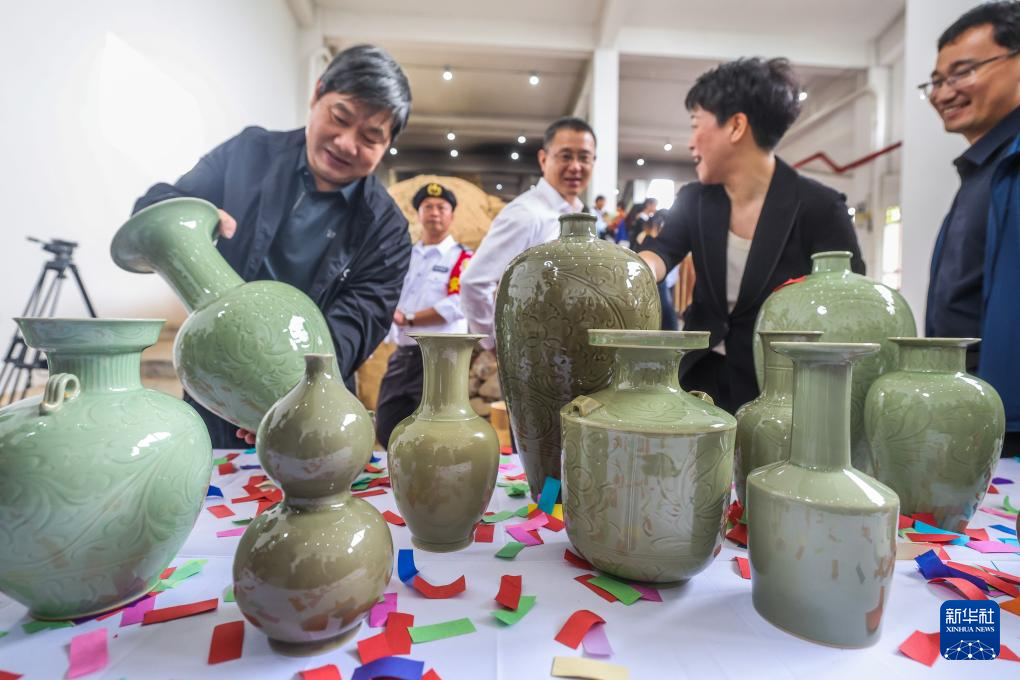 6月6日,在慈溪市上林湖青瓷传承园举行的开窑仪式上,嘉宾们把越窑青瓷从匣钵内取出。
