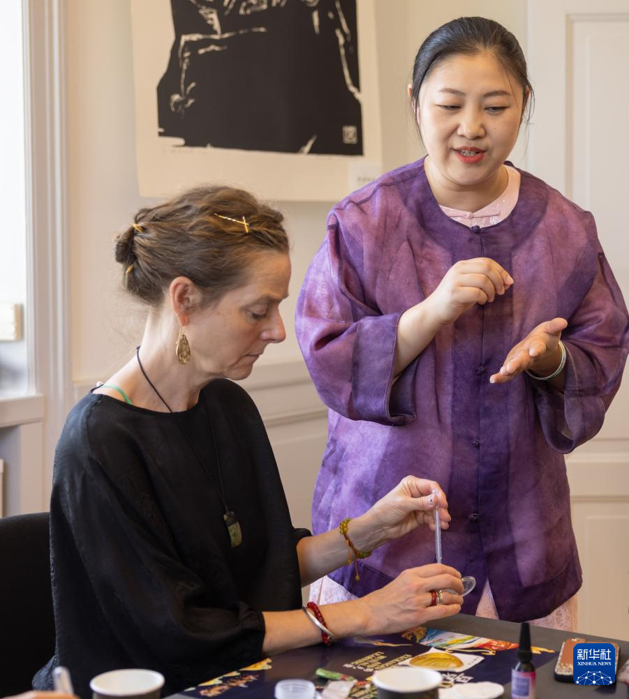 6月9日,中国艺术家在瑞典首都斯德哥尔摩中国文化中心现场指导观众制作端午主题的景泰蓝饰品。