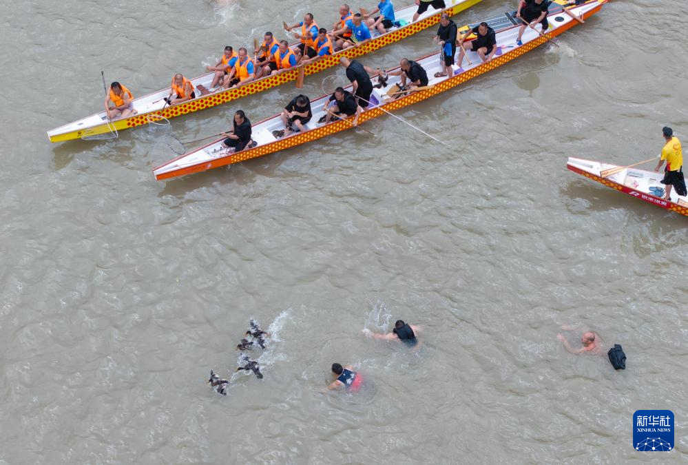 6月23日,群众在五通桥区小西湖里抢鸭子(无人机照片)。