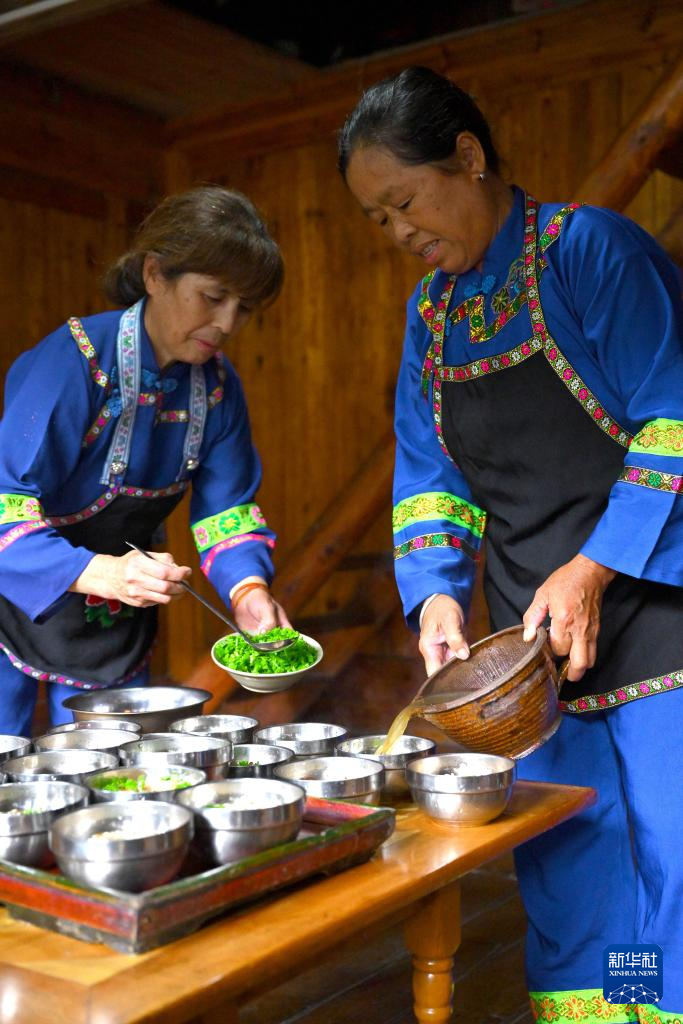 广西龙胜各族自治县伟江乡布弄村,村民为客人准备油茶(6月26日摄)。