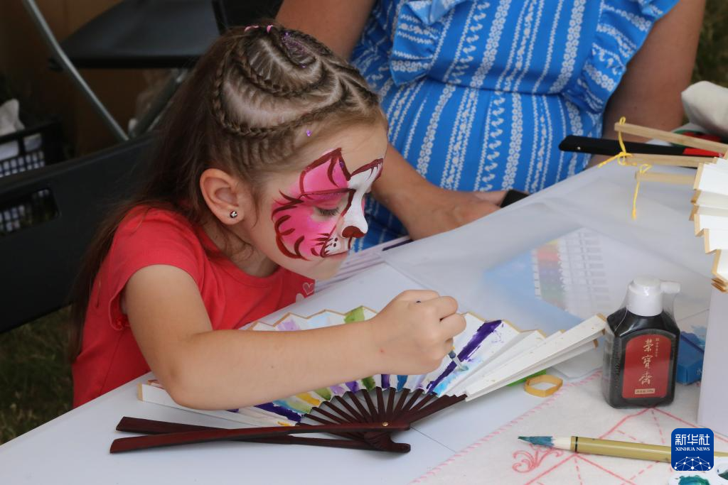 6月29日,在保加利亚索非亚,一名女孩在龙舟文化节上涂绘纸扇。