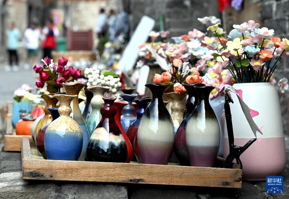 这是在河南省禹州市神垕镇一家钧瓷店铺外摆放的货品(7月3日摄)。