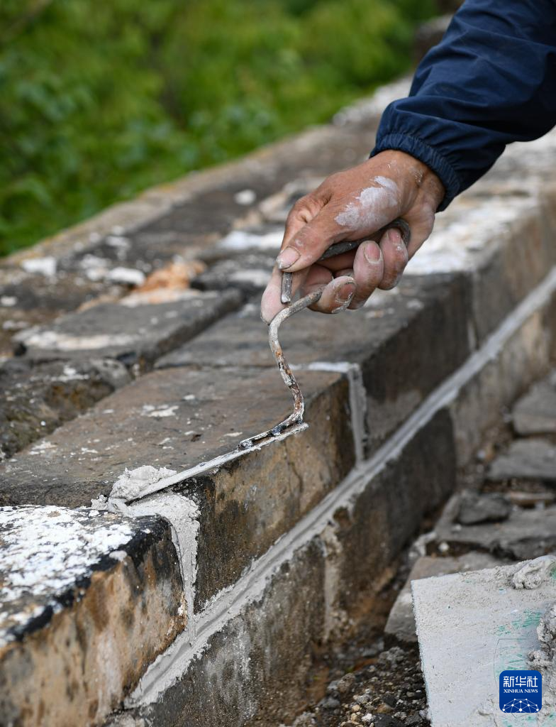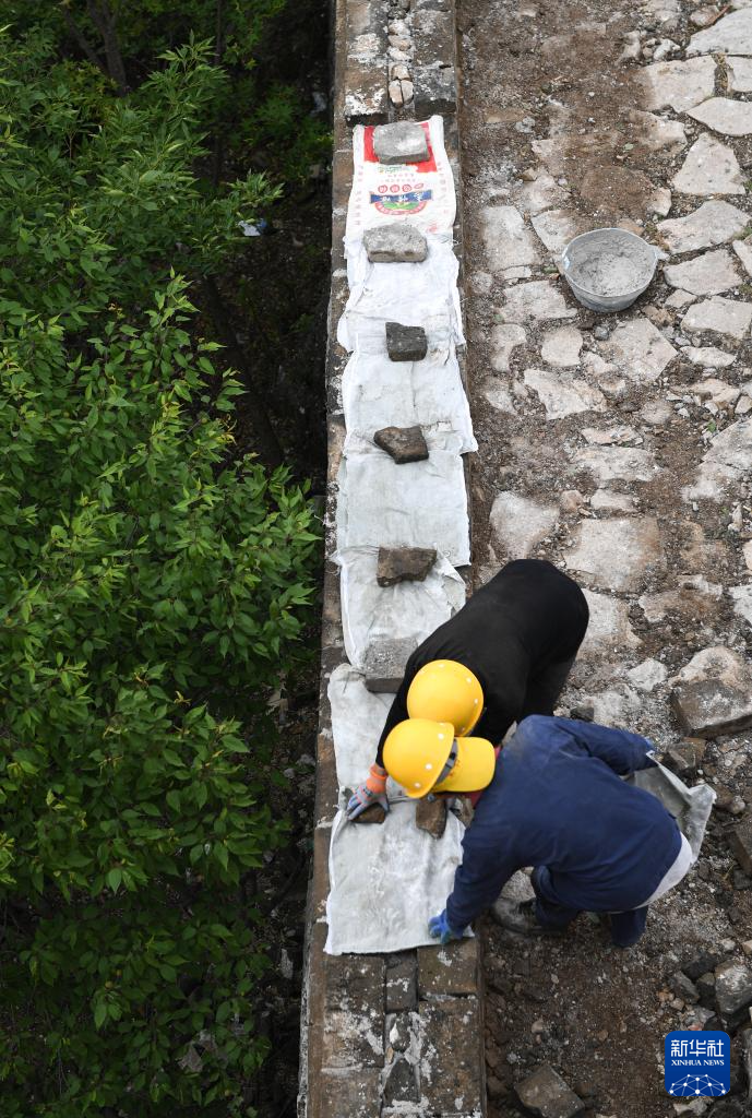 工人在已完成考古的箭扣长城122号敌台东侧墙体修缮受损的垛墙(7月2日摄)。