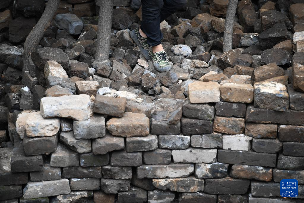 在箭扣长城120号敌台考古现场,工人们将挖掘出的老砖作为修缮施工材料垒起来(7月2日摄)。考古完成后,这些老砖将被用于修缮施工,以保留长城的古朴风貌。
