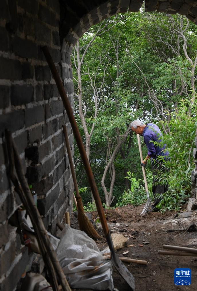工人在箭扣长城120号敌台进行考古清理,让被掩埋的建筑结构显现出来(7月2日摄)。