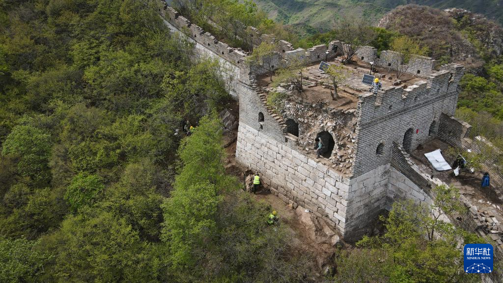 工人在箭扣长城121号敌台顶部进行考古清理(4月30日摄,无人机照片)。目前,该敌台已完成考古,进入修缮施工阶段。