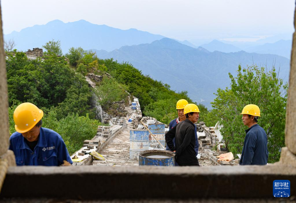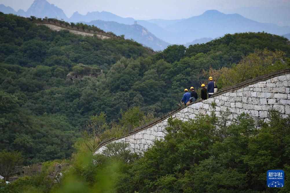 这是在箭扣长城122号敌台东侧墙体进行修缮施工的工人们(7月2日摄)。这段墙体已完成考古,进入修缮施工阶段。