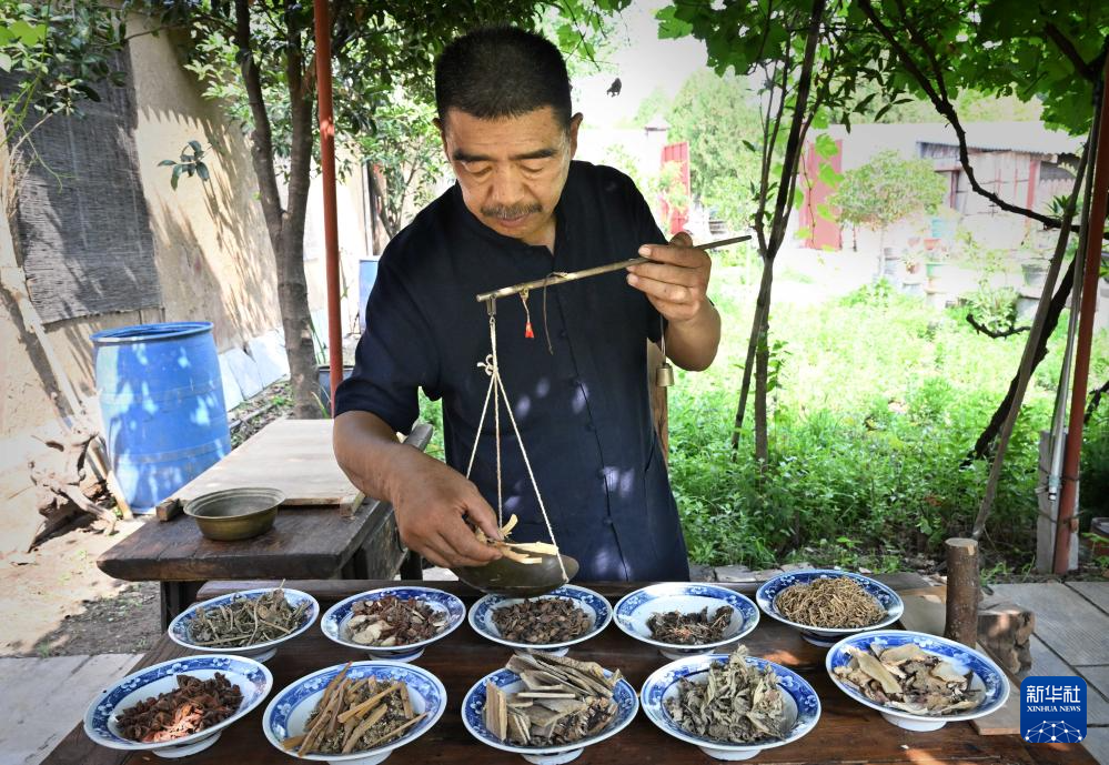 张书芳(右)在中草药种植园教儿子张力分辨中药材,讲解药材的药性(7月3日摄)。