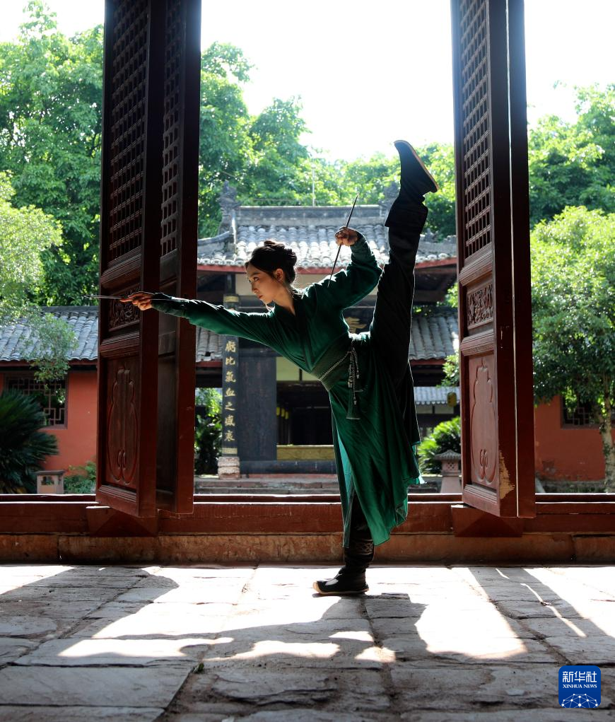 7月2日,“峨眉派女子功夫团”成员李诺菲在大庙飞来殿练习。新华社记者 杨进 摄