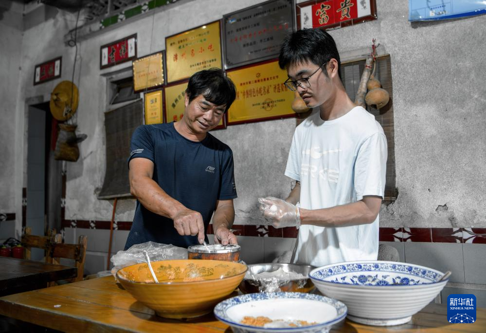 这是埭美村村民陈志平(右)跟父亲一起制作麻糍(7月10日摄)。2016年,大学毕业的他返乡创业,接手家传手艺,同时还致力于乡土文化的宣传。