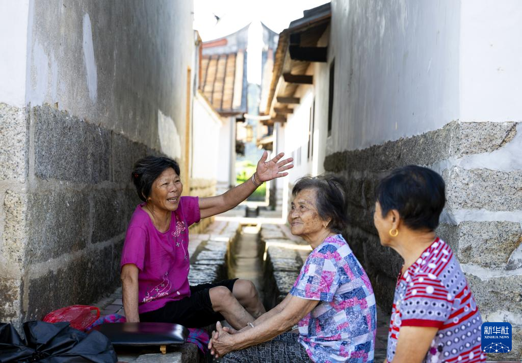 埭美村村民在古厝间乘凉聊天(7月10日摄)。