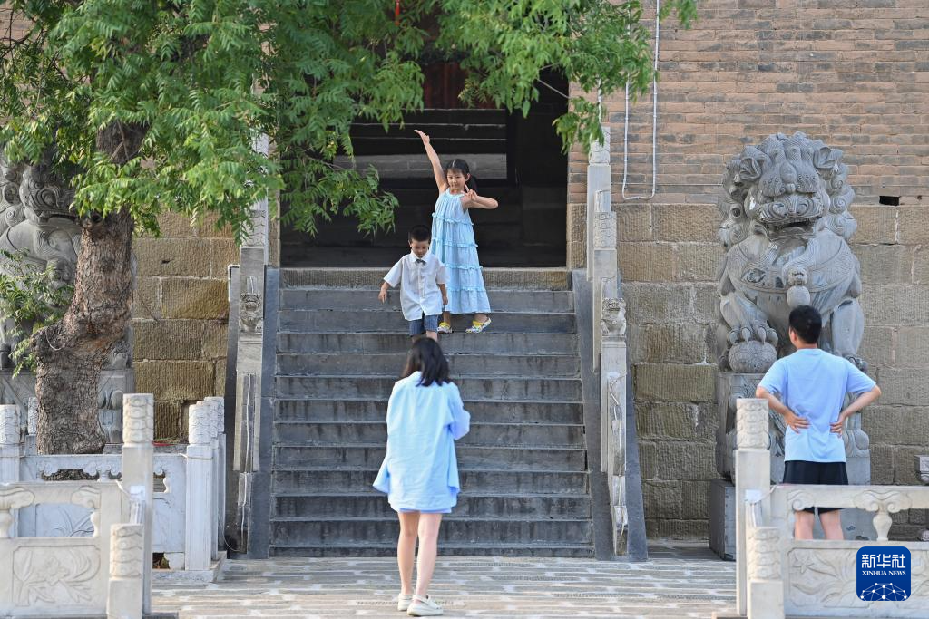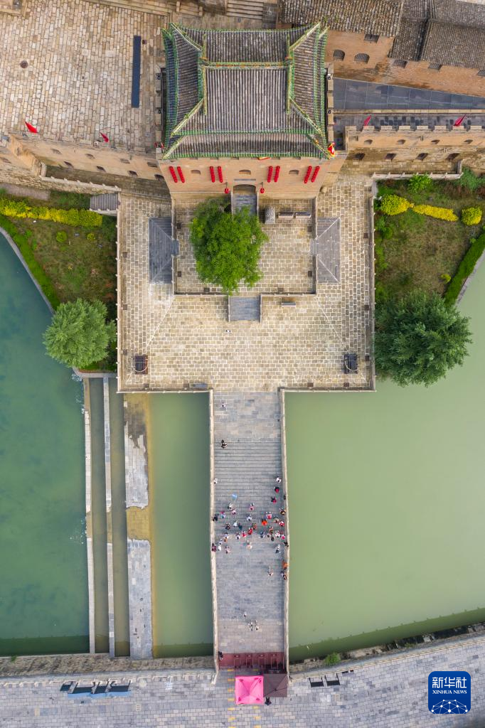 游客参观湘峪古堡(7月10日摄,无人机照片)。