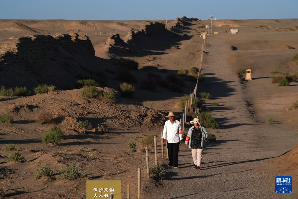 7月16日,张吉全和闻春瑜夫妇沿着汉长城巡护当谷燧(无人机照片)。
