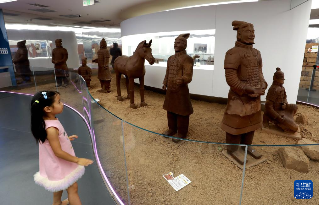 7月18日,小朋友在观看用巧克力制作的“兵马俑”。