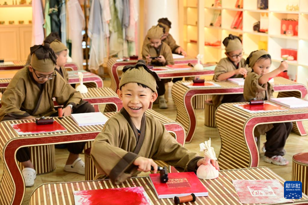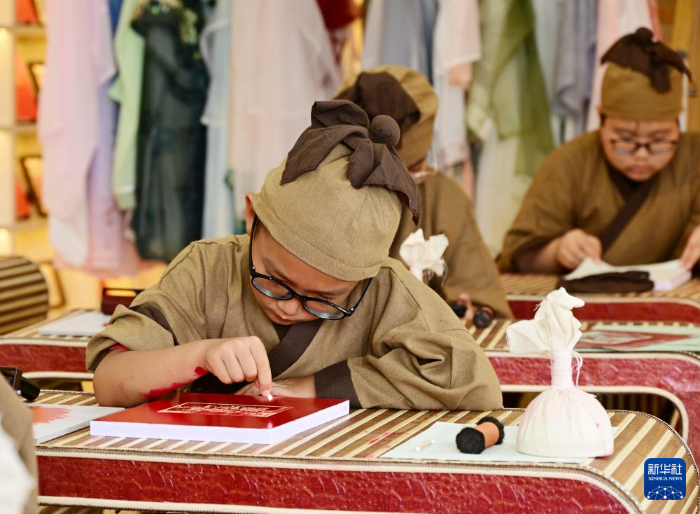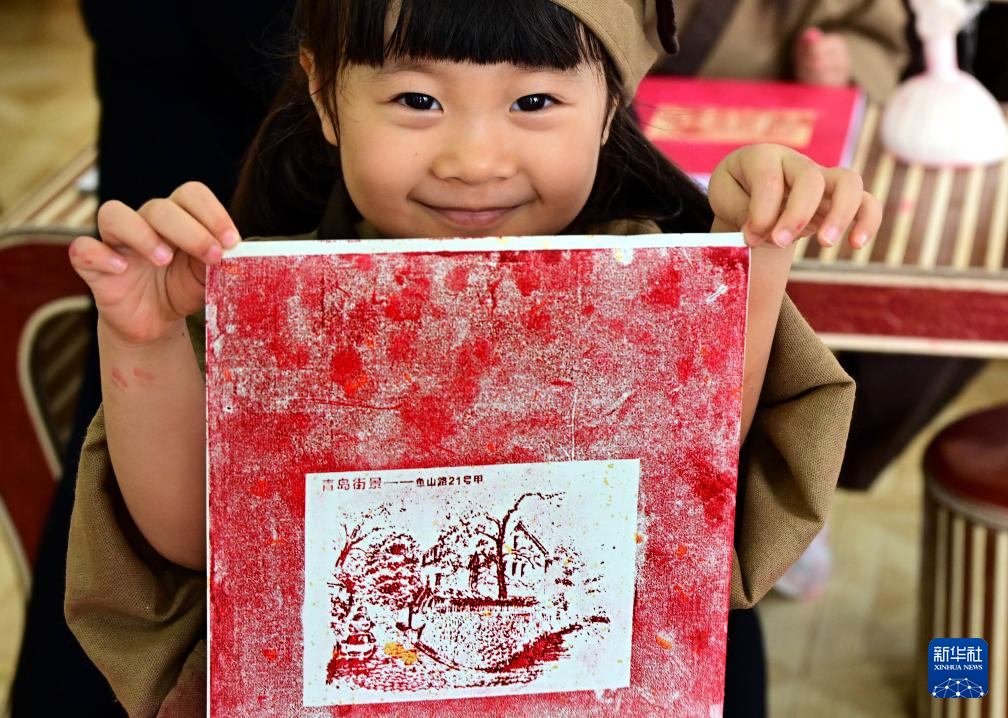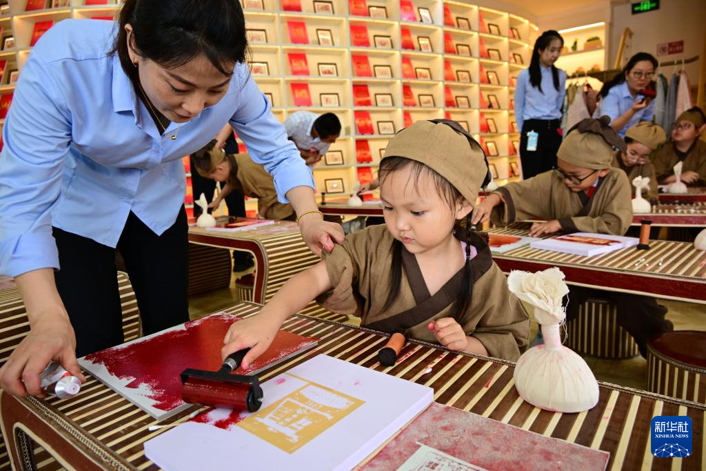 暑假期间,位于青岛栈桥书店的印象国风艺术馆举行拓印研学活动,吸引学生前来学习、体验。