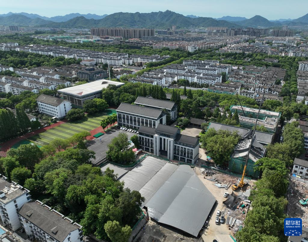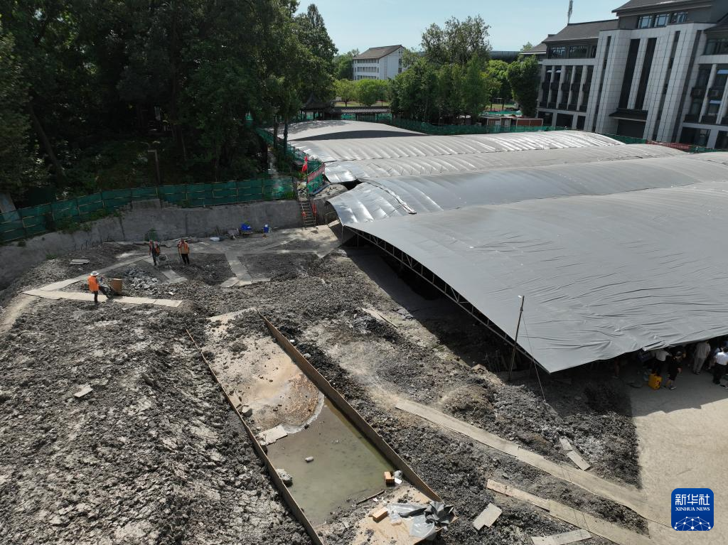 鸟瞰绍兴城内的稽中遗址考古发掘现场(无人机照片,7月23日摄)。