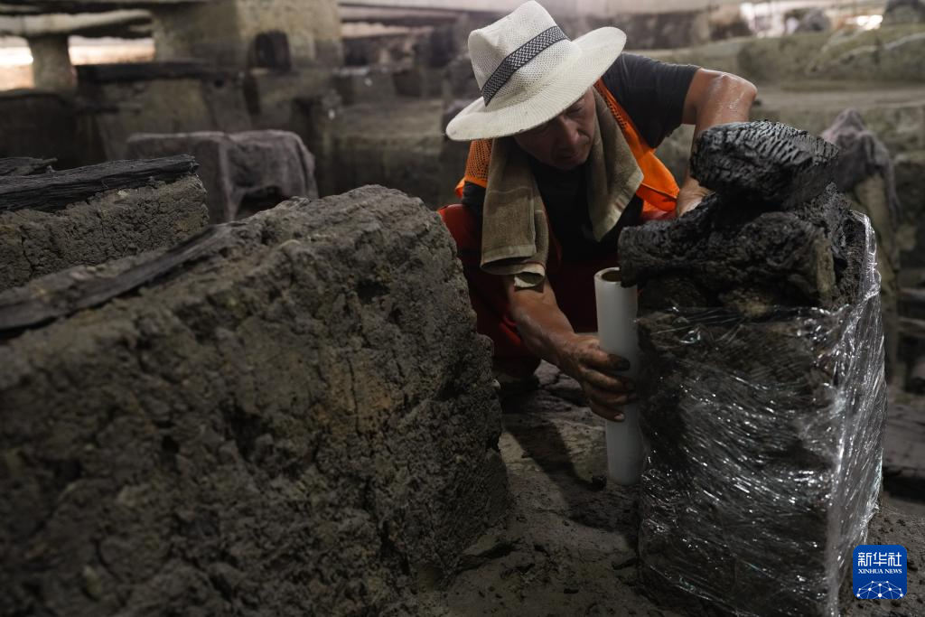 7月23日,考古人员在稽中遗址考古发掘现场保护发掘出的木质建筑构件。