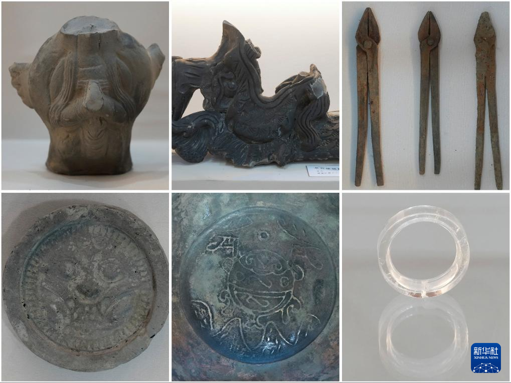 这张拼版照片展示的是稽中遗址出土的部分文物(7月23日摄)。上排从左至右:迦陵频伽石像、龙首木构件、铁钳;下排从左至右:人面纹瓦当、铜洗、水晶环。