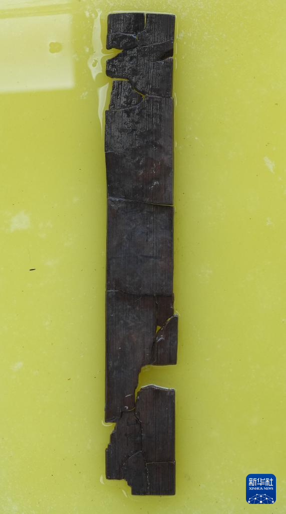 在绍兴市文物考古研究所拍摄的写有墨书“会稽”“山阴”地名的汉代木刺(7月23日摄)。