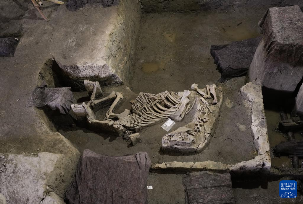 这是7月23日在稽中遗址考古发掘现场拍摄的古越国时期的马遗骸。