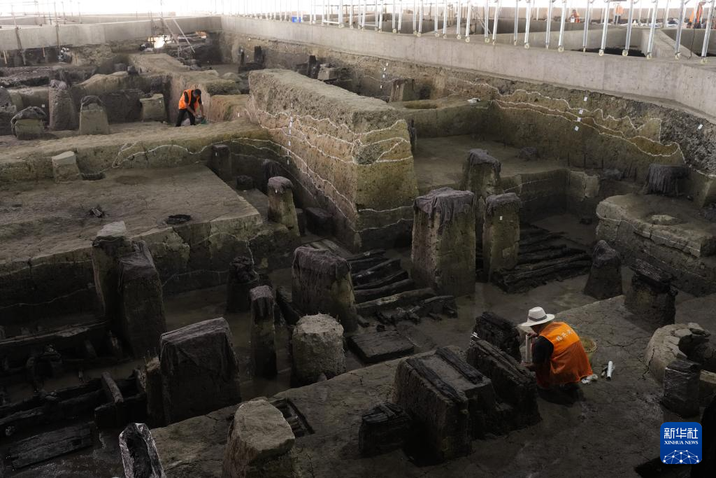 7月23日,考古人员在稽中遗址考古发掘现场工作。画面中部是发掘出的筏状地栿,为古代大型建筑地基的核心构件,用于承受地面建筑的压力。