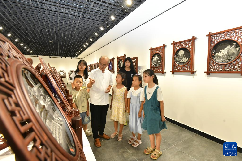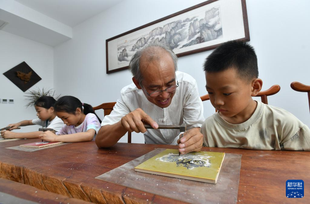 7月26日,在河间市刻瓷博物馆,刻瓷艺人指导小学生学习刻瓷技艺。