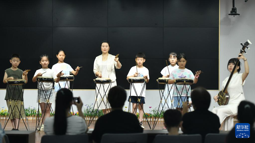 7月26日,在河间市第一实验小学,西河大鼓艺人指导学生学习西河大鼓。
